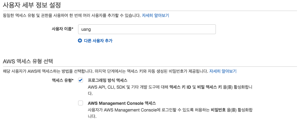 사용자 이름을 정하고, CLI 를 이용하므로 액세스 유형은 프로그래밍 방식 액세스를 선택한다.