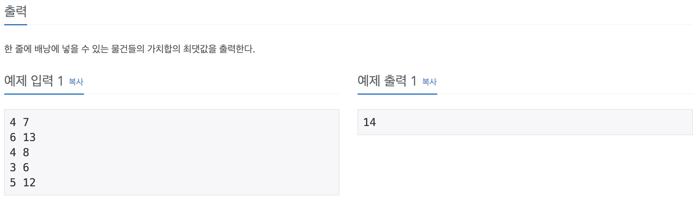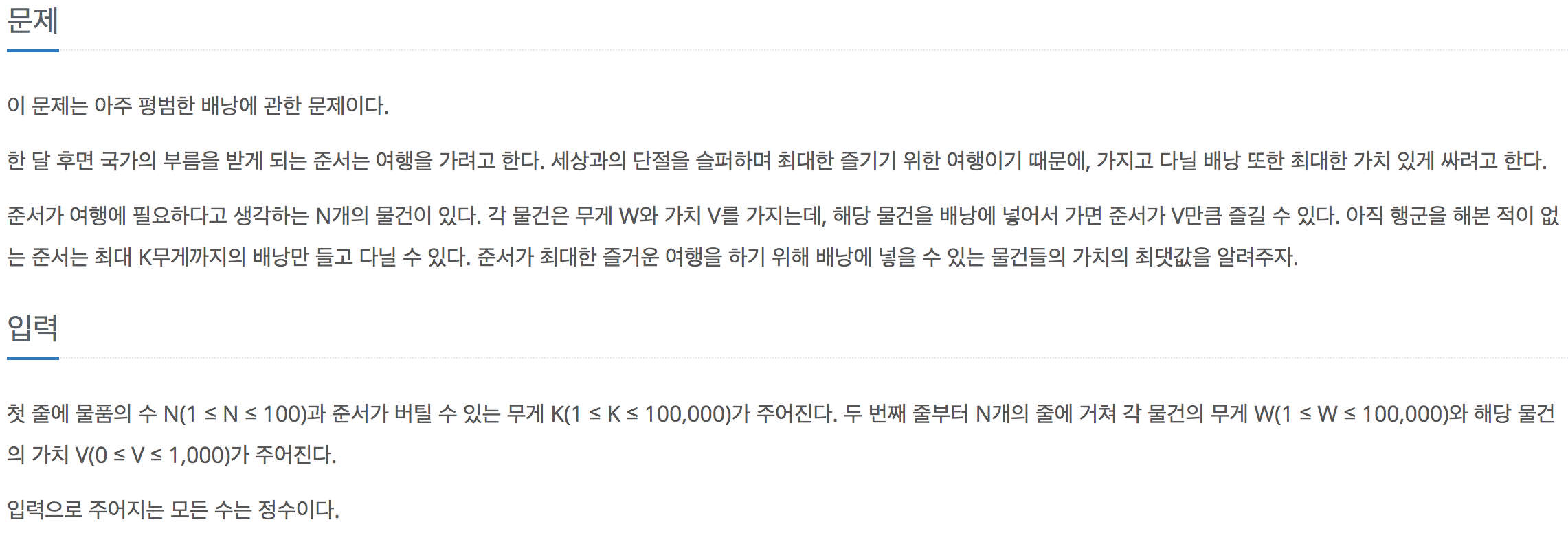 dp[p][q] = q 만큼의 무게를 들 수 있을 때, p 번째의 물건을 선택해 얻을 수 있는 최대의 가치