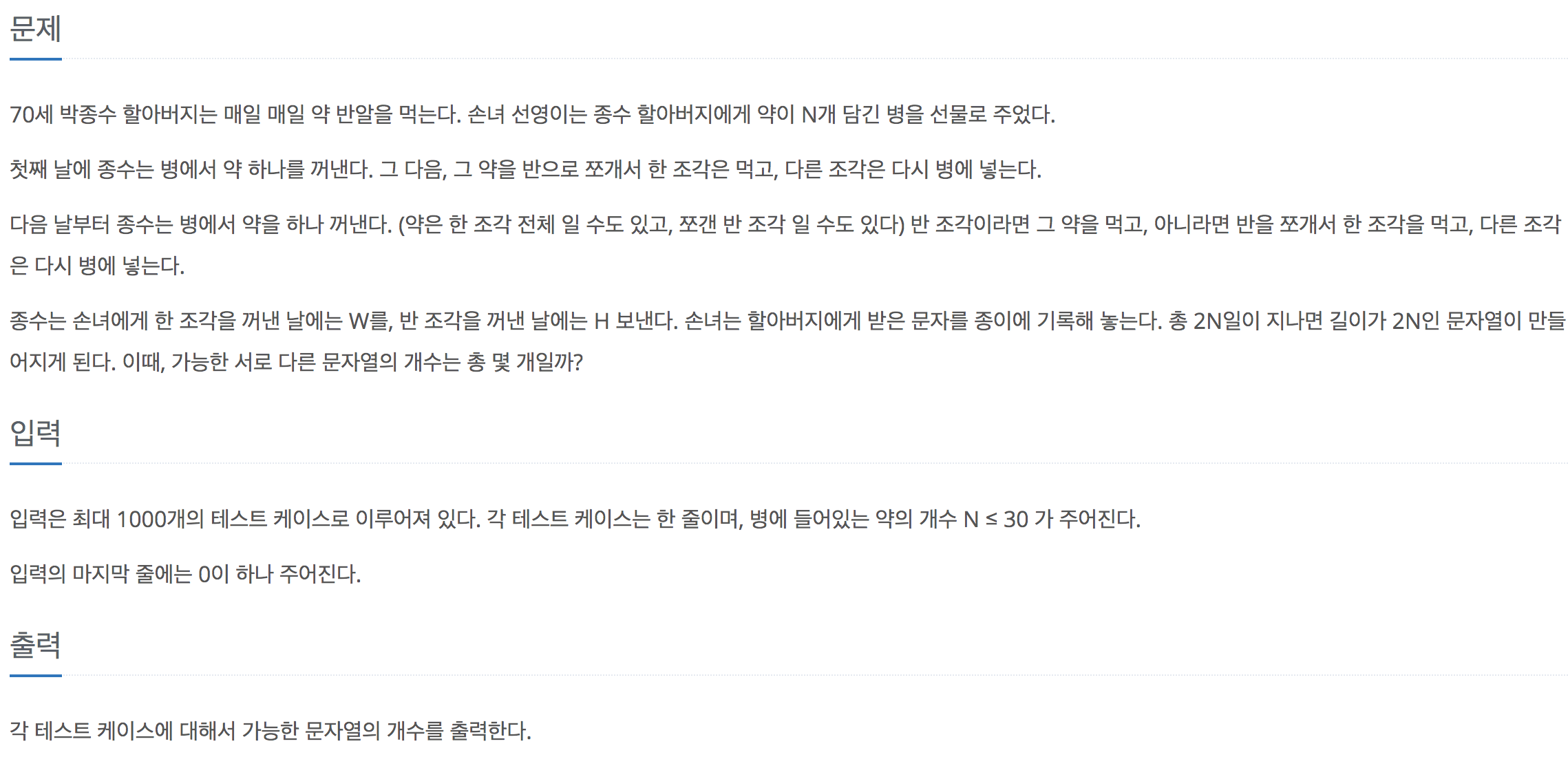 이 문제는 동적계획법(DP)으로 풀 수 있는 문제이다. 그 이유는 완전한 알약 갯수와 반쪽 짜리 알약 갯수가 주어질 때, 문자열의 경우의 수는 일정하기 때문이다. 따라서 DP는 다음과 같이 정의 할 수 있다.