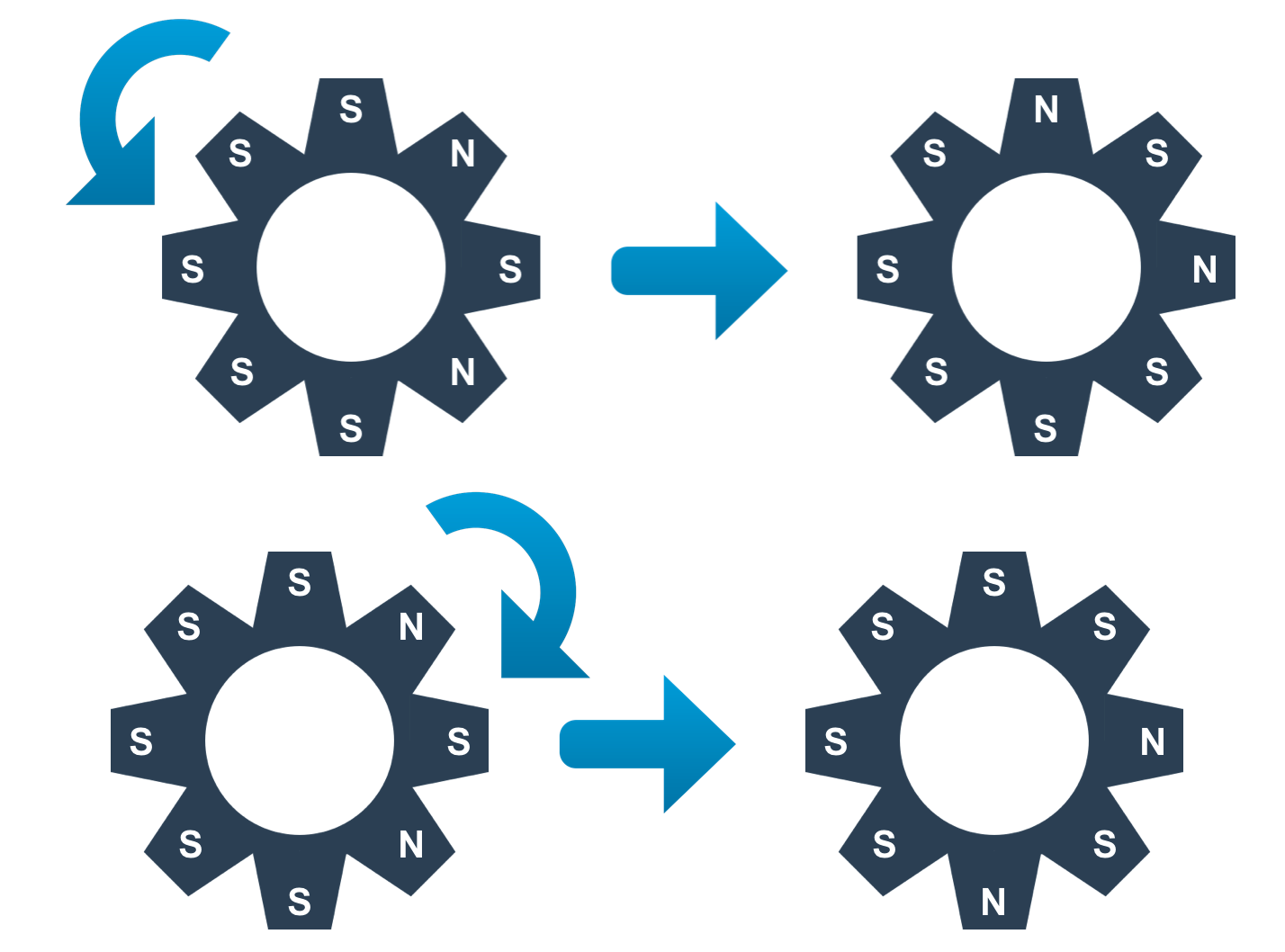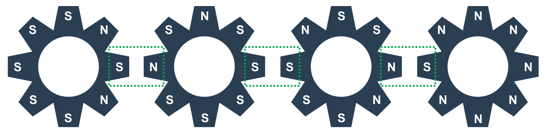 톱니바퀴의 수는 다음과 같이 4개로 고정돼 있다. 그리고 맞닿아 있는 극이 다를 경우 회전이 영향받는다. 즉, 만약 1 번 톱니바퀴가 반시계방향으로 회전하는 경우 2번째 톱니바퀴의 맞닿아 있는 극이 서로 다르므로, 2번 째 톱니바퀴는 반대방향인 시계방향으로 회전한다. 그리고 2번 톱니바퀴와 3번 톱니바퀴의 맞닿아 있는 극은 같기 때문에 2번이 회전할 때 3번 톱니바퀴는 회전하지 않는다.