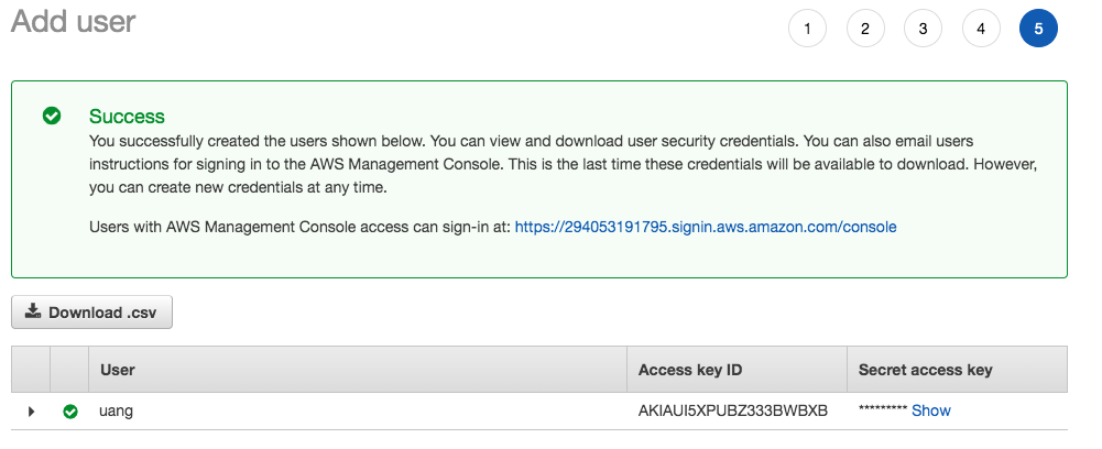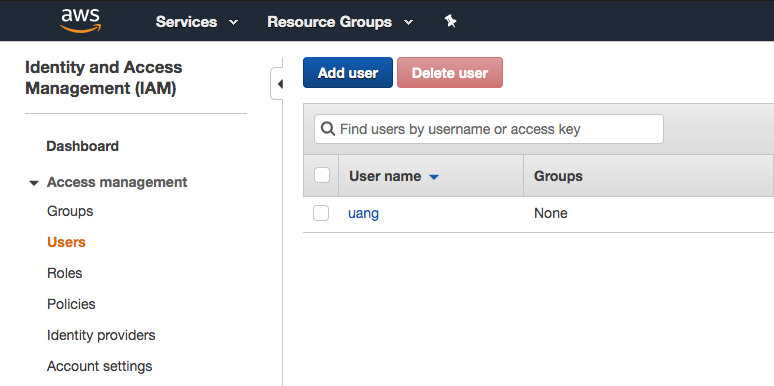 1. AWS 사이트에서 [Services] - [Security, Identity, & Compliance] - [IAM] - [Users] 에서 사용자를 추가