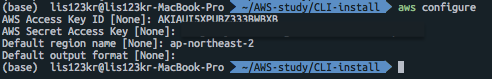 생성한 IAM 유저의 Access key ID 와 Secret access key 값을 이용해 터미널 상에서 설정하면 된다.